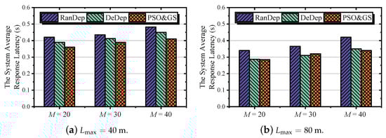 Figure 5 shows the system average response latency obtained by PSO&GS and the benchmark algorithms for different M and . As shown in Figure 5, regardless of the variation of M and , the proposed PSO&GS has a significant performance advantage over RanDep. Specifically, the performance advantage of PSO&GS is particularly substantial for larger . The reason for the above phenomenon is that when the maximum service distance of the UAV is large, high-quality UAV deployment enables the UAV to cover more GDs, so that more GDs offload their computation tasks to the UAV for processing, thus making full use of the UAVs’ computational resources. When low-quality UAV deployment is employed, even if the maximum service distance of the UAV is large enough, it results in some GDs being unable to access the UAV, thus limiting the utilization of computational resources. In addition, PSO&GS are better than DeDep in optimizing the system average response latency except for and m. In summary, we can demonstrate the effectiveness and superiority of PSO&GS outer PSO-GA in achieving optimization of UAV deployment.