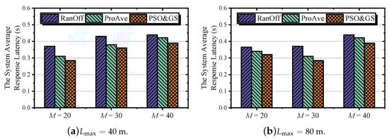 Figure 6 shows the system average response latency obtained by PSO&GS, RanOff, and ProAve for different M and . As shown in Figure 6, the proposed PSO&GS performs best in various scenarios, followed by ProAve and the worst by RanOff. It is because the proposed PSO&GS is optimized in both device access and computation offloading compared to random-based computation offloading and thus can significantly improve the performance. For ProAve, the proposed PSO&GS is significantly better than the average distribution in computation offloading optimization. Therefore, the Greedy algorithm proposed in this paper can achieve better optimization results when the maximum service distance of the UAV is larger.