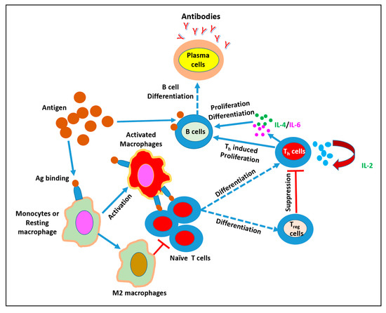 Immune cell interactions network leading to T-cell-dependent antibody synthesis via T-cells and B-cells after PWM (Ag) stimulation. PWM is captured, processed, and presented by APC to T-cells inducing their activation via cell–cell interaction between T and B-cells. The activated T-cells recognize and bind the Ag on the surface of a B-cell. This complex induces the release of interleukin-2, -4, and -6 (IL-2, IL-4, IL-6) from Th1 and Th2 cells, resulting in activation and differentiation of B-cells into memory cells and antibody-secreting PCs. Macrophages, naïve T-cells, B-cells, Th-cells, Treg-cells, and various cytokines are key elements that promote, suppress, or secrete antibody synthesis.