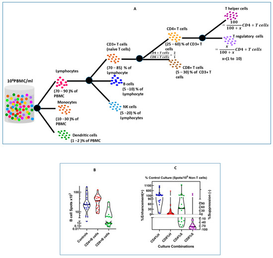 (A) Shows the immune cell distribution in normal PBMC. (B) Shows the generic B-cell response profiles of each combination- CD4+ T-cells + B-cells (non-T-cells) or CD8+ T-cells + B-cells (non-T-cells) compared to control cells. (C) Shows the result of B-cells EliSpot response to Ag-stimulated purified CD4+ (CD4%H) or CD8+T helper cells (CD8%H) or CD4+ (CD4%S) or CD8+T suppressor cells (CD8%S) compared to control B-cell response.