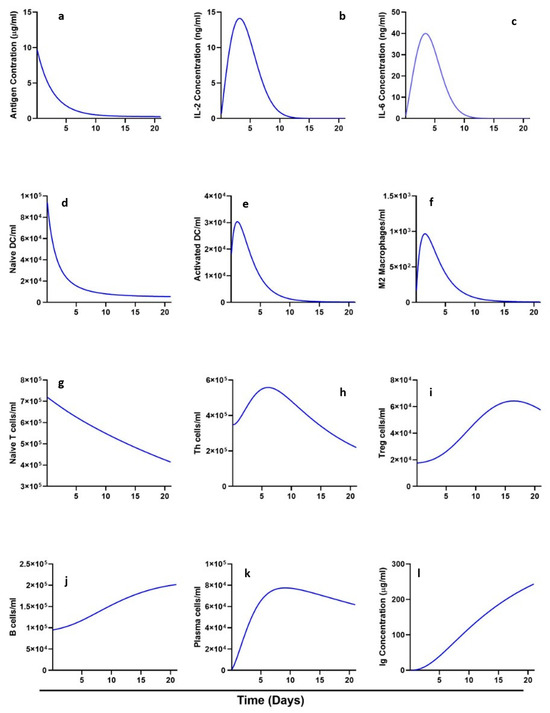 This study reports a mathematical model for normal T-cell-dependent B-cell antibody synthesis using PWM. This system reflects changes in tightly regulated responses by helper and regulatory T-cells that could be used to simulate dysregulated immune responses [6,63]. The kinetics of the temporal interactions for Th, Tregs, B, and dendritic cells were incorporated in the model for optimum production of PWM-stimulated antibody production, which is consistent with in vitro experimental data [13,16,19,64,65]. The key question for this model was “what are best proportions of T-cells, T-cell subsets, B-cells, and APC required to generate optimal antibody synthesis in a 3-week time frame? To address this question, various conditions were simulated using different parameter values to optimize the differentiation of B-cells to Ig-producing PC (Figure 3). The peak proliferative response of Th was on day 6, which was associated with a concurrent rise in PC numbers that peaked on day 8. Unlike the rapid increase in PC, the increase in the accumulated Ig production continued up to day 21 (Figure 3k,l). Data in Figure 3 were consistent with our previous in vitro studies [13,16,19,64,65] that were considered optimal for all immune parameters.