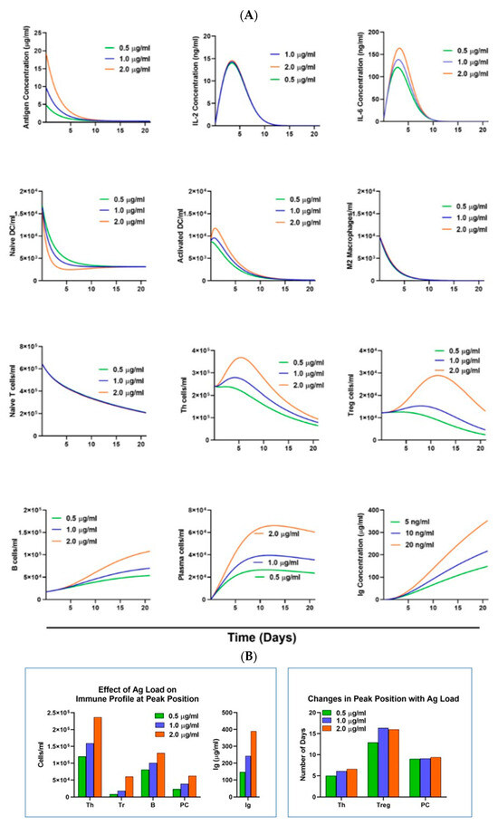 (A,B) The effects on the immune response of varying the antigen dose from 0.5 g/mL to 2.0 g/mL. Apart from Tn and IL-2, all the variables showed a significant variation in their profiles as well as their peak positions. The Th, Treg, B-cells, and PC showed a greater variation in their levels and Ig in their concentration compared to other immune cells and cytokines.