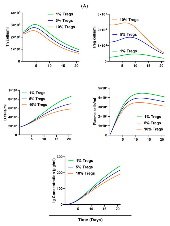 The effects of increasing or decreasing the proportion of Tregs on Ig production are shown in Figure 5A,B. Similar to the simulation results of varying the Ag dose, changing the proportion of Treg initial value qualitatively and quantitatively affects profiles of immune response. As the value of Tregs increased from 5% to 10% (2×), there was a ~10% decrease in Th cells accompanied by a slight decrease in their peak position while the peak value of Tregs increased by 60% compared to standard Tregs numbers at 5%. The number of PCs diminished by 10%, resulting in a corresponding decrease in Ig produced.