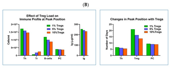 Given that Tregs in healthy subjects vary from 1 to 10% of Th, simulations were conducted at 1%, 5%, and 10% of Th (Figure 5A). Th, Treg, B, PC, and Ig were the components that apparently changed with varying initial values of Tregs. The shifts for each of the above-mentioned components were statistically different by <0.05. Except for Tregs, all other variables decreased by ~10%. The most remarkable was a 5× increase in Treg cells while Th showed a ~16% decline when the initial value of Treg was increased from 1 to 10%. Similarly, B-cells, PC, and Ig showed a decline in their overall profiles when Treg initial values increased to 10%. Changes in peak heights of these variables are shown in Figure 5B (left panel). Unlike the Treg population, B-cells, PC, Th, and Ig decrease in magnitude. This behavior is consistent with a healthy immune system response. B-cells declined by 32% while PC declined by 22% when Tregs increased from 1 to 10%. There was a concomitant decline in Ig synthesis while the PC numbers declined. In Figure 5B (right panel), we show the shifts in the peak positions of immune variables. Th, Treg, and PC showed decreases in the peak position with increasing Treg initial numbers. The largest shift is in the Treg maximum peak position, which shifted to day 6 from day 10 on increasing proportions of Tregs from 1% to 10%.