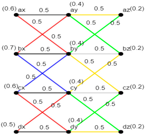 Using Definition 10, the edge membership values of the above constructed MF1 * MF2 were calculated, as shown in Figure 6.