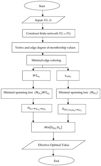 | Input: ) respectively. Output: Optimal fuzzy network Begin Step 1: Construct a collection of finite networks, e.g., , by performing separate operations on a fuzzy network with vertex sets . Step 2: Calculate of all edges. Vertices are to be labeled as 1, 2, 3,…, n Step 3: using the operations applied to the constructed network. Steps 4: In the constructed network, e.g., N1, identify vertex ‘1′ of the maximum degree and color all its incident edges such that no two incident edges receive the same color. Step 5: Next, focus the direct neighbors of vertex 1, color the incident edges of the neighboring vertex, and label them as 12, 13, …, 1m, if there are m neighbors. If the number of neighbors is less than m, then use the minimum number of the same color used for vertex ‘1′. Step 6: Proceed with Step 5 again until all the edges receive the colors. From the above step, we get the minimum number of colors used to color the given network. Steps 4, 5, and 6 will continue for the other constructed networks to find the minimum number of colors used to color the edges of the networks. Step 7: Find the minimal edge coloring set with the minimum number of colors used to color the established network and the corresponding optimal weight of the colors. Step 8: and let it be , respectively. Step 9: , respectively. Step 10: Determine the minimal spanning tree of the constructed networks, e.g., of , respectively, and let its corresponding minimum weight of be Step 11: Let denote the sum of the lower domination number of established network Ni and the minimum weight of spanning tree Ni, that is, is the sum of the weight of the basic colors used in establised network Ni and the minimum weight of spanning tree Ni, that is |