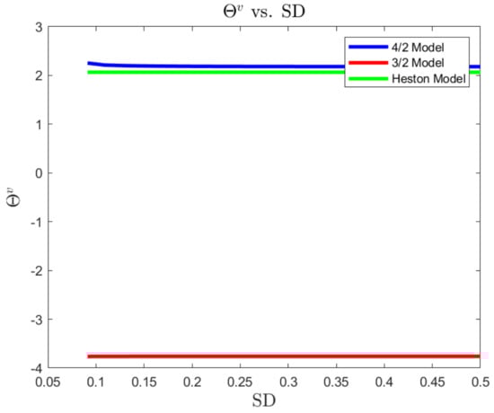 where , a and b are positive constants, and are constant. The process represents the market price of variance risk, and is the market price of stock risk. Moreover, can be understood as the market price of stock idiosyncratic risk (i.e., with respect to ). Note that in this form of market price of risk, the excess return of the risky asset is proportional to its variance, as recommended in the economics literature; see [] Equation (II.6), type I. As for the market price of variance risk , we use Ito’s lemma to create the process of the variance: