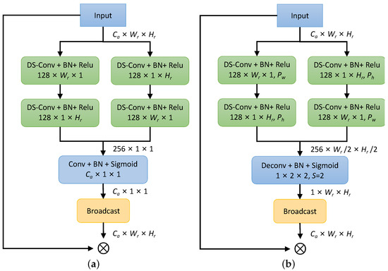 In our work, we follow the global channel attention and use the depthwise and spatially separable convolutions to encode the input feature maps with a global receptive field. A key difference is that we add the spatial padding ( or ) along the horizontal or vertical direction to the feature maps before each convolution operation. The purpose is to preserve sufficient spatial cues by keeping the feature maps at a 1/2 downsampling rate during encoding. Then, we use a deconvolution operation with a stride of two and a sigmoid activation to generate the spatial weight map with the input spatial size.