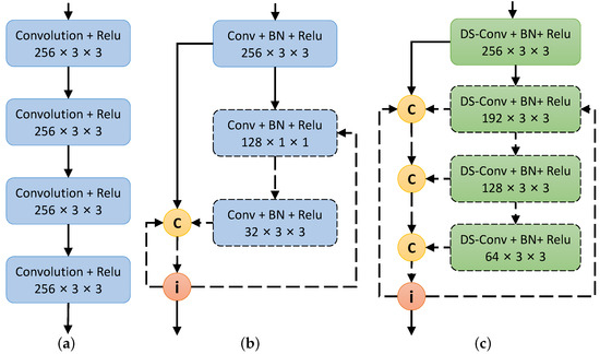 In the early RM-CNN model [24], the head architecture is typically designed as a stacked encoding structure, as shown in Figure 3a. Through 4 stacked convolutions with 256 channels, the input features are encoded with increasing receptive field size to capture the spatial context. However, the number of stacked layers is limited using a single gradient flow between them. Too many stacked layers would cause the vanishing gradient problem during training. In addition, this stacked encoding scheme easily leads to excessive parameters and computational cost. Figure 3b shows a dense encoding scheme in DenseNet [29], which introduces dense skip connections into a predefined composite unit containing successive and convolutions with 128 and 64 channels, respectively. The dense encoding scheme can effectively improve the gradient flow of a network by adding layer connections when performing the i-th encoding operation. However, the #Params and MACC of each encoding operation are increased by 4096 and , respectively. This would result in a rapidly increasing model complexity if the encoding operation is performed multiple times.