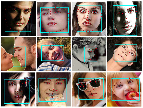 - Zhu, M.; Shi, D.; Zheng, M.; Sadiq, M. Robust facial landmark detection via occlusion-adaptive deep networks. In Proceedings of the IEEE/CVF Conference on Computer Vision and Pattern Recognition, Long Beach, CA, USA, 16–20 June 2019; pp. 3486–3496. [Google Scholar]