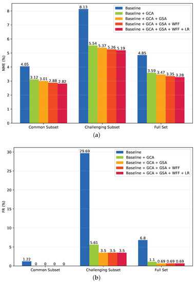 Comparison of NME (%) (a) and FR (%) (b) on the 300W common subset, challenging subset and full set. Note: “Baseline” denotes a vanilla RM-CNN model, “GCA” denotes the global channel attention block, “GSA” denotes the global spatial attention block, “WFF” denotes the within-task feature fusion scheme, “LR” denotes the location reweighting strategy.