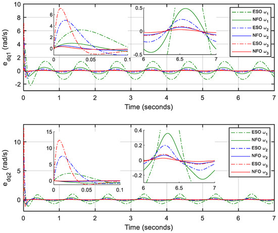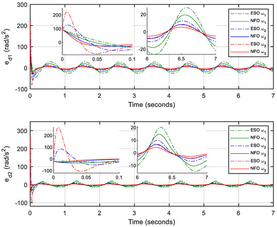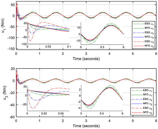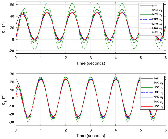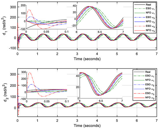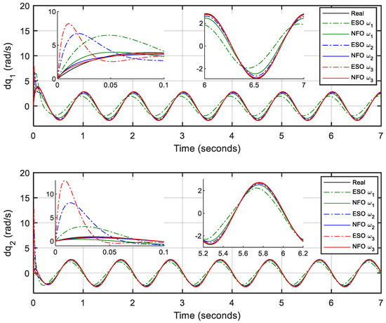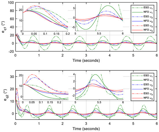 For fair and comprehensive comparisons, different observer gains are selected as , , and for both the NFO and ESO with the same initial conditions. Besides, a computed torque controller (CTC) is adopted as the main controller with control gains and . The design of the CTC is presented in Appendix A.