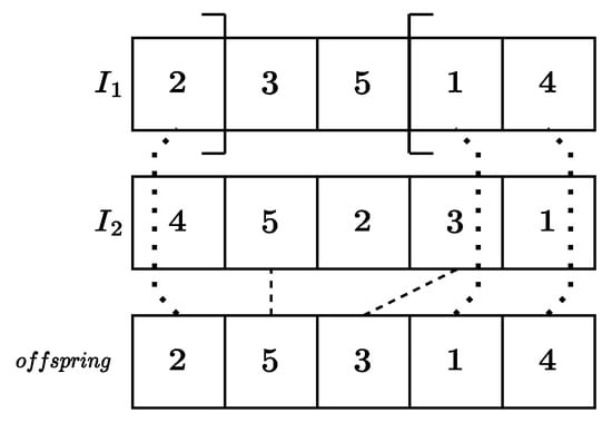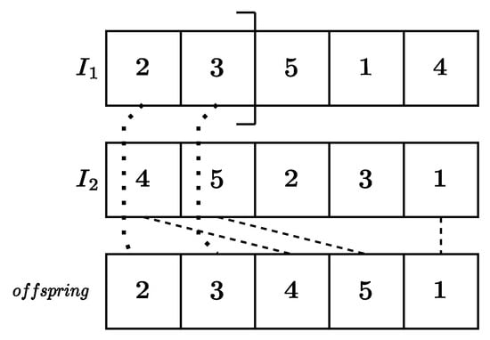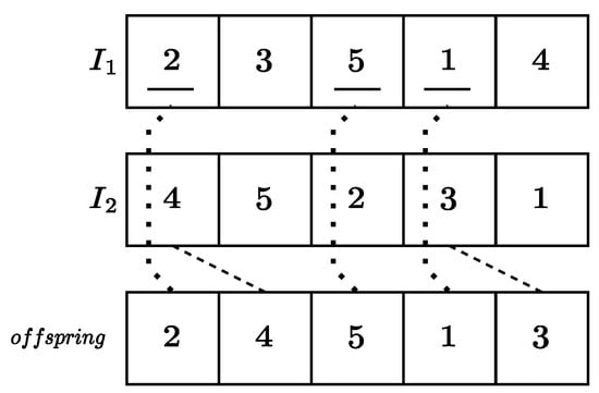 Figure 1. One-point crossover with . - Two-point crossover. Two indices are randomly selected. Assuming , the first i jobs and the last ones are inherited from , while the remaining are inserted in the sequence preserving the order they have in (see Figure 2).