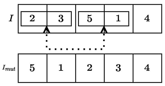 - Arbitrary batch change. Given two random positions , assume . Then, an integer s (the batch size) is randomly determined in the interval and, for , the jobs in the positions and are swapped (see Figure 6).