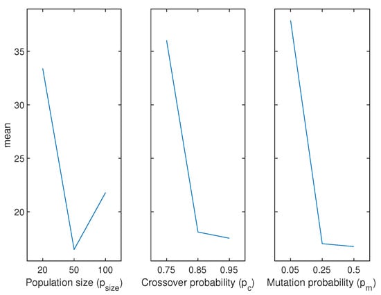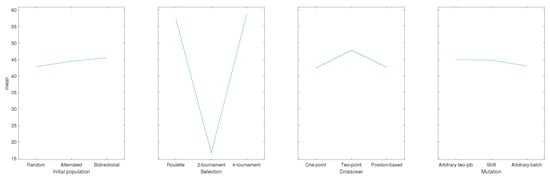 In particular, apart from the maximum number of iterations () that we have set equal to 1000 as in [7], our heuristic is defined in a function of three numerical input parameters (, , ) and four categorical parameters (the inner procedures Initial population, Selection, Crossover and Mutation), the latter to be chosen among the different strategies proposed in the previous section and summarized in Table 2. On the possible values of the numerical parameters, our proposal is reported in Table 3 (three different values for each parameter), resulting in a total of seven parameters and combinations for the overall setting of the algorithm. Due to the huge number of these combinations, the parameters’ setting was simplified by adopting the strategy described in the next subsection.