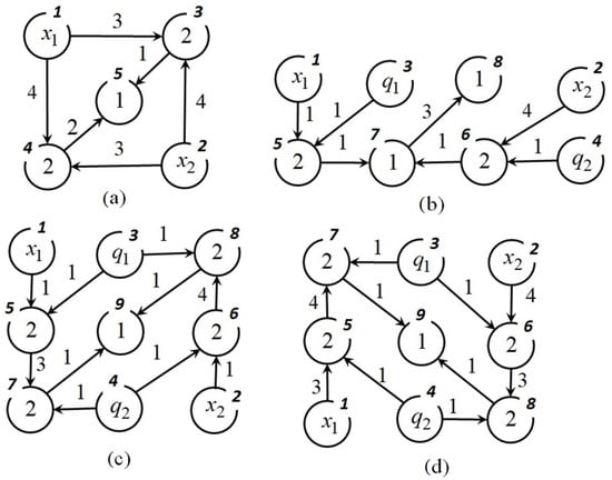 NOP-graphs for mathematical expressions (21), (a) , (b) , (c) , (d) .