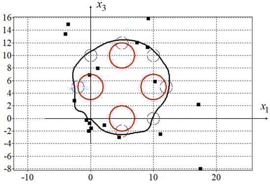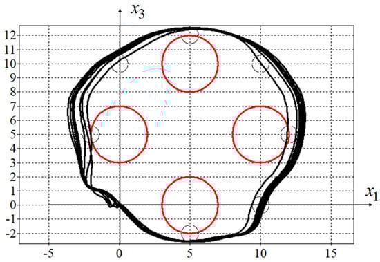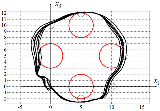In Figure 3, projections of the optimal trajectory on the horizontal plane are presented. Here, red circles are phase constraints described by (45), small black circles are passing areas described by (46) and small black boxes are control points (48).