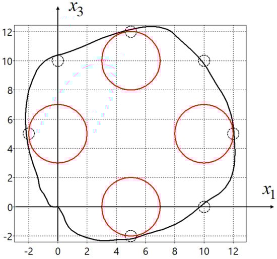 Since the initial state in the problem coincided with the terminal state, in order to force the control object to move along a closed path, mandatory conditions for passing through certain areas were added to the quality criterion. For trajectories that meet the criteria for passing through the specified areas, the value of the quality criterion will not change at . This is seen in Figure 3 and Figure 4 as both trajectories pass through all specified areas.