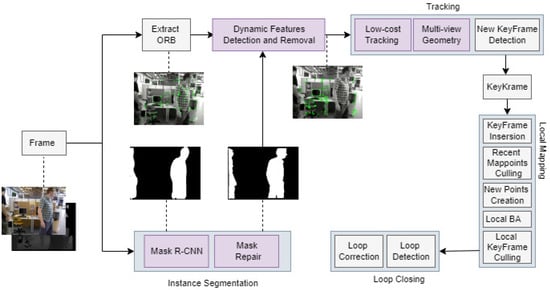 The flow of the entire system is shown in Figure 1. The system first inputs the RGB images captured by the camera to the feature extraction and instance segmentation threads, respectively. In the input images, we divide objects into three categories: static objects, dynamic objects, and potential dynamic objects. Among the three categories, dynamic objects mainly refer to human beings, and potential dynamic objects refer to those objects that are usually stationary and move due to other factors at a certain time (such as chairs moved by people, etc.). The system extracts all the image’s static and dynamic feature points in the feature extraction thread.