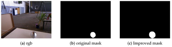 As shown in Figure 2a, a small ball is slowly rolling on the table, and Figure 2b is the initial mask image of the RGB image after Mask R-CNN segmentation. It can be seen from the figure that although the segmented mask image is close to the outline of the small ball, its edge part is still quite different from the complete object outline. To improve the mask’s incompleteness, the median filter is first used to process the mask, which aims to eliminate the potential speckle noise in the small object mask and protect the edge part of the mask. Then, the erosion and dilation operation is used to make the edge part of the mask closer to the original object as much as possible. Finally, the improved small object mask image is shown in Figure 2c. The figure shows that the inpainted mask is closer to the original object shape than the original mask.