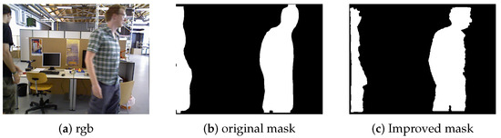 where represents the depth value on the pixel. Finally, the original mask is replaced by the fused depth region represented as a binary image. Algorithm 1 gives the specific steps of mask restoration. As shown in Figure 3, the optimized mask is more refined to the contour of the object region than the original mask.