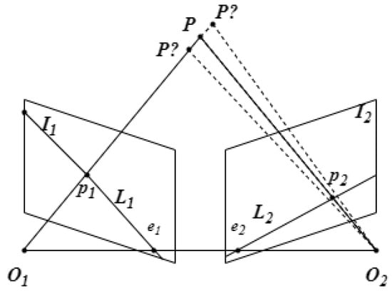 Let points and be the imaged points of point P in two continuous frames, respectively, and and be the epipolar lines of the two corresponding planes. The normalized coordinates of and are expressed as: