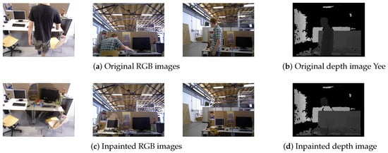 Background inpainting results: (a) we show three RGB input frames, and in (c) we show the output of our system, in which all dynamic objects have been detected and the background has been reconstructed. (a) and (d) show, respectively, the depth input and output, which has also been processed.