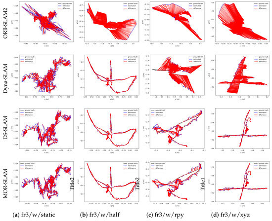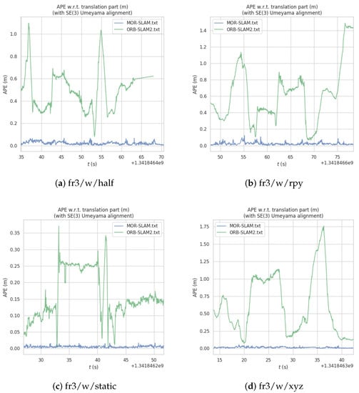 In addition, we used the evo tool (https://github.com/MichaelGrupp/evo, accessed on 22 May 2023) to draw a targeted ATE comparison between ORB-SLAM2 and MOR-SLAM on four highly dynamic sequence data sets. The ATE comparison results between MOR-SLAM and ORB-SLAM2 are shown in Figure 6. We use SE3(3) to align the motion trajectory with the ground truth trajectory. As can be seen from Figure 6, the pose error of MOR-SLAM is significantly lower than that of ORB-SLAM2.