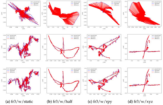 Qualitative results of ablation experiments on the TUM RGBD dataset. The first row is the result of the original ORB-SLAM2 experiment. The second row is the experimental result after adding the Mask-RCNN module to the original ORB-SLAM2. The experimental results of adding Mask-RCNN and mask repair module simultaneously on the original ORB-SLAM2 are shown in the third row.