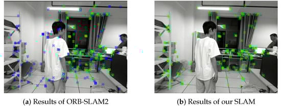 To prove the MOR-SLAM’s effectiveness, we conducted experiments on MOR-SLAM in a practical environment. In this experiment, a person walked around the scene. We used a handheld RealSense D455 camera to collect a large number of RGB images and their corresponding depth images of the surrounding environment. The size of RGB images and depth images are all 640 × 480. Figure 9 shows the experimental results of ORB-SLAM2 and MOR-SLAM in the practical environment. In Figure 9a, ORB-SLAM2 extracts many features on walking people, while in Figure 9b, MOR-SLAM removes the feature points on moving people, and almost all the extracted feature points fall on the static background.