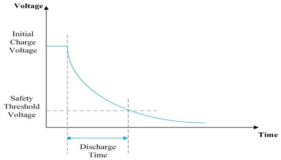 This subsection mainly discusses a simple settling time analysis method for detecting and calculating the average stable time in order to rapidly detect PID phenomena. First, Figure 2 shows a typical test curve of PID failure cases. Since the solar cells’ resistance attenuation decreases with time, the parallel resistance decreases rapidly at the beginning of the testing, and it becomes stable in the late stage. The falling process of parallel resistance is like the discharge process of a capacitor. The discharge process of the resistance capacitance (RC) circuit is shown in Figure 3. That is, the process of a solar cell’s parallel resistance changing with time is like the discharge process in the RC circuit [33]. Thus, when the discharge voltage reaches 95%, it is at the safe threshold voltage. Given the above reason, this study takes the discharge process of the RC circuit as reference and combines the resistance attenuation characteristic of the solar cells. Thus, this study accordingly defines a settling time analysis method for addressing the resistance attenuation of solar cells. Through the settling time analysis method, the solar cells with PID phenomenon can be effectively found [34]. More importantly, this method can shorten the testing time and improve the production efficiency for the factory by appropriately judging the phenomenon of PID problem earlier.