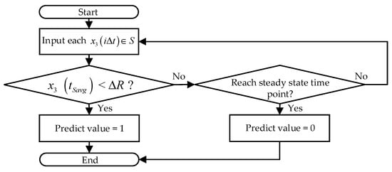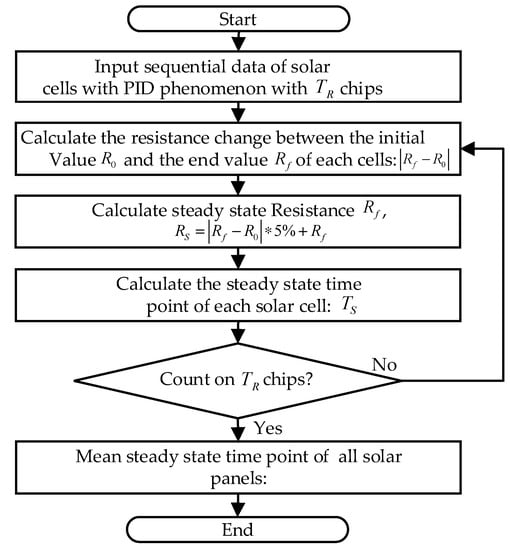 - Second, the starting time point of the parallel resistance measured by the PID simulation tester is defined as ; its initial value is defined as the end detection time point is defined as with a chips, and the final resistance value is defined as . In addition, assuming that is a steady-state time point, the corresponding measurement value is . and are calculated by the testing data of each solar cell. The average steady-state time value of the steady-state time point is defined as . The flow chart for calculating the settling time model is shown in Figure 4, and its training process is described as the following pseudo-codes example.