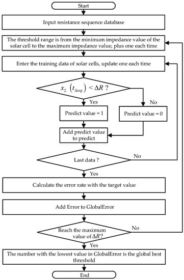 - Third, after receiving the average steady-state time value , it searches all the corresponding resistance values in the testing data and calculates the average resistance value. Then, it can be used to judge the threshold value. The mathematical formula is formatted as follows: , is a rational number. The flow chart for optimizing the steady-state time threshold of solar cells is shown in Figure 5.