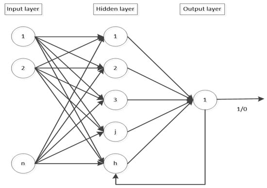 Before training ANN works, it is necessary that the training example data, the size of the mathematical neural network model, the number of hidden layers, and the neuron in each layer, be determined in advance; however, the input layer and output layer should be determined according to the type of problems. In the setting of neurons in hidden layer, Kwok and Yeung’s network constructive algorithm is used [35]. This method sets the minimum number of hidden layer neurons and increases the neurons until the error reaches the tolerance range. The structure of the neural network is shown in Figure 7. Moreover, for the constructive algorithm [35] on the number of hidden neurons, its setting method is formatted by the following statements: (1) set the minimum number of hidden layer neurons, (2) increase the neurons, (3) train the networks, (4) stop only until the error reaches the tolerable range, (5) otherwise, increase the number of neurons gradually, and (6) determine the number of neurons.