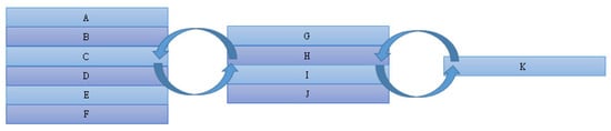 In this study, the mathematical neural network is divided into the following three stages: training stage, validation stage, and testing stage. Training data is defined as , validation data is defined as , and testing data is defined as . The data types employed in all three stages are consistent and are composed of independent datasets, aiming to achieve fair and impartial detection purposes. If the training data is 2 or 3 times more than validation data, the experimental results will have a high accuracy [36,37]; if training data is 4 times more than testing data, the results can provide good accuracy [38]. Therefore, the ratio for the training data, validation data, and testing data is set in 4:2:1. Diagram of mathematical neural network data construction is shown in Figure 8. From Figure 8, the training data of this neural network includes datasets A, B, C, D, E, and F, the verification data includes G, H, I, and J, and the final testing data is K. Each piece of data is equal and can be randomly rearranged multiple times for experiments.