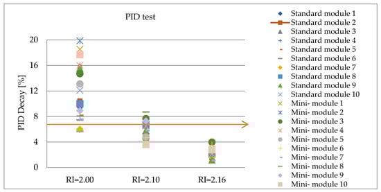 - When RI is 2.00, the number of tests for the large module is 10, and the number of pass tests in the PID test is 0, = 0. The number of tests for the mini module is 10, and the number of pass tests in the PID test is 0, = 0, and = 0 < +10%. That is to say, the large module and the mini module also have a positive relation to the PID test at RI = 2.00.