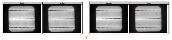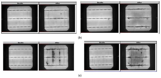 PID susceptibility is tested with IEC62804 standard conditions (i.e., 60 °C, 85% relative humidity, negative bias 1000 V, and 96 h test time), and solar cells with three different RI values are prepared for comparison operation [31,32]. To make the experimental design closer to the general solar cell company’s solar cell design, the selected RI values of the three groups are 2.00, 2.10, and 2.16, respectively. In general, the higher the RI value indicates the denser the anti-reflection layer, the less likely it is to produce the PID phenomenon. Each group takes several large modules and mini modules for highlighting the results of comparison testing. To avoid interference with experimental results in the testing due to material factors, the mini modules use the same packaging material as the panel of large modules. In accordance with the specifications of IEC 62804, if the power measured during the PID testing exceeds 5% compared to the initial value, the module is deemed to have failed the PID test. Importantly, for the part of the mini modules, we add an EL image to observe and measure whether there is the situation of PID failure case. The following mathematical formations are defined as the process for comparison.