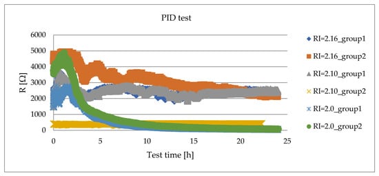 - When RI is 2.16, the number of tests for the large module is 10 and the number of tests passed by PID is 10, then = 100%. The number of tests for the mini module is 10, and the number of passed PID tests is also 10, = 100%, − = 0% < +10%. That is to say, the large module and the mini module are positively related to the PID test at RI = 2.16.
