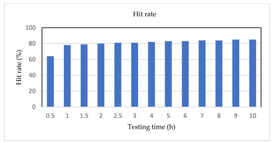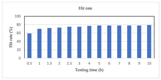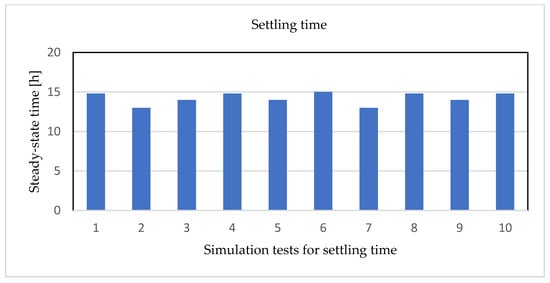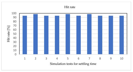 In the experimental results, Figure 12 and Figure 13 show the average steady-state time point and testing accuracy in a bar chart. In Figure 12, the X-axis represents the series number of simulation tests for settling time, and the Y-axis represents the steady-state time values (h) of each cell. After implementing the settling time analysis, the average steady-state time is about 14 h from Figure 12, and the hit rate (accuracy) is about 94% from Figure 13; as a result, it is a good outcome.