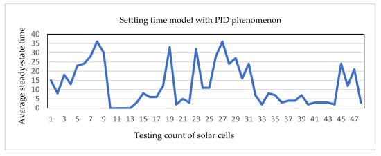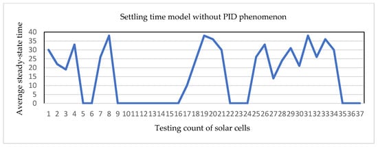 Finally, the samples with PID phenomenon and without PID phenomenon are tested separately to further verify the testing results of the settling time model. The X-axis represents the number of testing counts for solar cells, and the Y-axis represents the average steady-state time. Figure 14 and Figure 15 show the empirical results of with PID phenomenon and without PID phenomenon in the type of line graph, respectively.