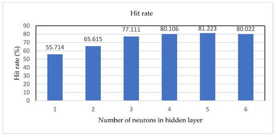 Accordingly, when training the mathematical neural network, the accuracy of the neural network with different numbers of neurons in the hidden layer is measured. Figure 16 shows the experimental results of different numbers of neurons in a hidden layer in the type of bar chart. It is found that when the neural network has the highest hit rate, the number of hidden layers is five; therefore, the number of neurons in the hidden layer is determined to be five neurons.