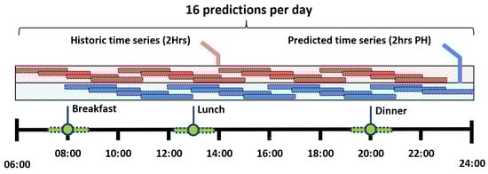 Graphical representation of prediction periods and mealtimes within ±50 min of variability (green). A total of 16 prediction windows per day comprising 2 h of historical time series (red) and 2 h of time series for validation and training (blue).