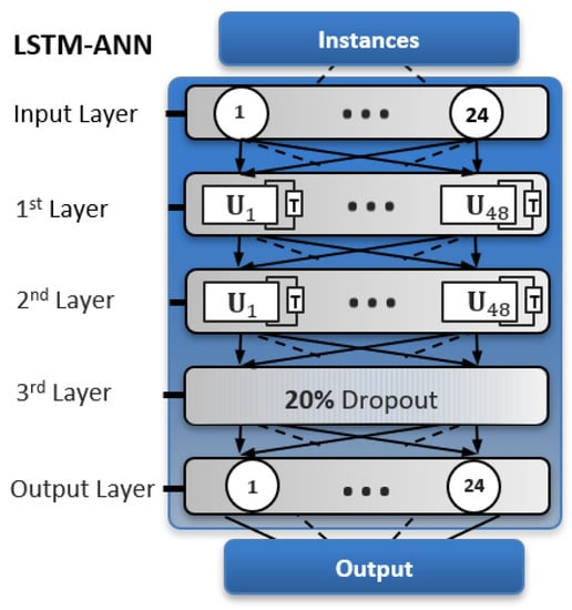 In previous related studies, a variety of ML techniques have been applied to the task of generating diabetes prediction models [7], where the most common techniques are based on artificial neural networks (ANNs). ANN models are trained to extract features from the input values based on their hidden parameters and generate outputs that minimize a loss function concerning the observed outputs. Once trained, ANNs can estimate the expected output for new unobserved data. These networks have demonstrated a great ability to self-learn from data, and as a result, they have become some of the most effective and widely used methodologies in studies based on ML methods. Different variants of ANNs have been applied for BG predictions or for the classification of adverse glycemic events (see [12,13,14,15,16,17,18,19], among others). In this study, a time-series prediction approach based on a Recurrent Neural Network (RNN) with a long short-term memory (LSTM) [20] architecture is proposed. The LSTM architecture is based on the previously validated model in [21], in which carbohydrate, insulin, and BG sequences of recent values were used to estimate upcoming values for BG levels. The main architecture implemented is shown in Figure 2. A four-layer architecture consisting of two LSTM layers of 48 units, an intermediate 20% drop-out layer, and an output dense layer was defined. The model was fed with the values from the time series for the last two hours of the BG, insulin, and carbohydrate sequences. A stochastic optimizer based on an adaptive moment estimation algorithm [22], together with a loss function implementing a root mean square deviation, was applied to guide the algorithm through the training process and, finally, to assess the goodness of the final BG predictions. The LSTM networks were trained for 60 epochs using a batch size of 8 and a validation/training ratio of 20/80.