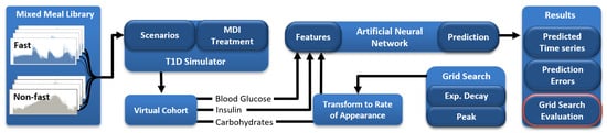 Based on the hypothesis that the amount, timing, and composition of carbohydrate intake are elements with a significant impact on future blood glucose (BG) levels, it was proposed that the performance of data-based prediction models should be analyzed when the carbohydrate information is manipulated. This hypothesis was partially tested in [11], in which different digestion curves were used to feed a machine learning model to assess the accuracy when predicting upcoming values of BG levels. In this study, an ML predictive model (described at the end of this subsection) was also applied to the problem of predicting BG in people with T1D using the simulated dataset described in the previous subsection, in which the absorption curves and the meal information are known. The current study’s focus was on proving that the results of BG predictions, and hence the performance of ML techniques, is strongly tied to the accuracy and veracity of the available meal information, such as the type and amount of food, and meal timing information.