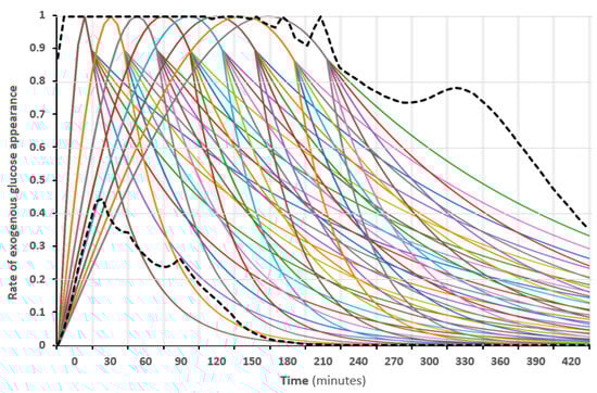 A model was implemented to generate different RA curves to mimic real RA curves in the dataset by using a parametric curve generator. The model is based on the combination of a cubic polynomial function and an exponential decay function (see Equation (1)). The initial phase of the RA response, representing incremental blood carbohydrate uptake, is represented by the polynomial function, while the decreasing rate of carbohydrate uptake is represented by an exponential function. Thus, the model is based on two essential parameters: the time to a maximum peak of the curve and the exponential decay of the curve. The RA shapes generated by this model can represent a wide range of curves by combining both parameters. Figure 4 shows all of the curves that were generated for the experiments presented in this article. On the one hand, the parameter representing the peak time at which the meal has a maximum action is staggered at an incremental time interval ( {20 min, 40 min, 1 h, 1 h 20 min, 1 h 40 min, 2 h, 2 h 20 min, 2 h 40 min, and 3 h}). On the other hand, an exponential decay parameter was configured to boost the fall in the rate of glucose appearance at six increasing rates ( {0.6, 0.8, 1.05, 1.45, 2.2, and 3.85}). The dashed line in Figure 4 captures the overall variability in the real values obtained from the mixed-food library used to generate the experimental data.