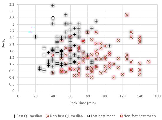 Scatter plots of the analyzed parameters, the exponential decay, and the peak time generated by the meal. The filled shapes represent the mean value of the best solution for all patients, while the empty shapes show the median of the first-quartile solutions for each patient.