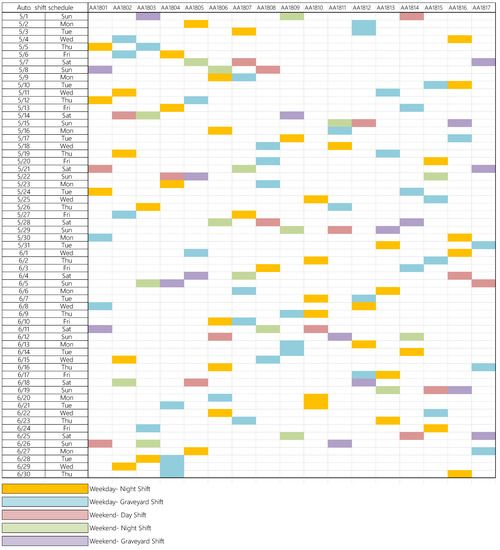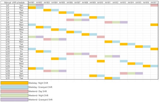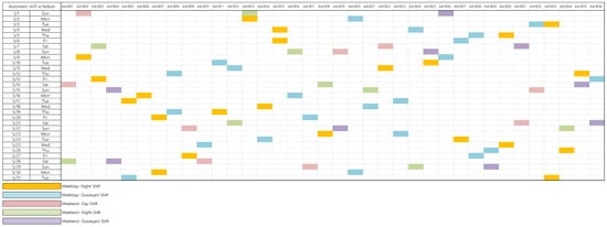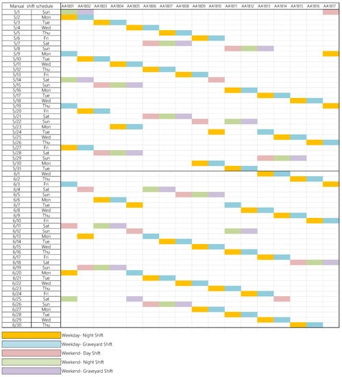 In Figure 2 and Figure 3, both of the models meet the requirements of the company’s shift regulations, namely, a 12 h interval between shifts and two non-consecutive weekends. The only difference is that manual assignment requires a post-scheduling constraint check and then micro-adjustment. However, automatic scheduling can be directly planned by adding restrictions, eliminating human error and the need for additional staff to check the conditions, which helps enhance efficiency.
