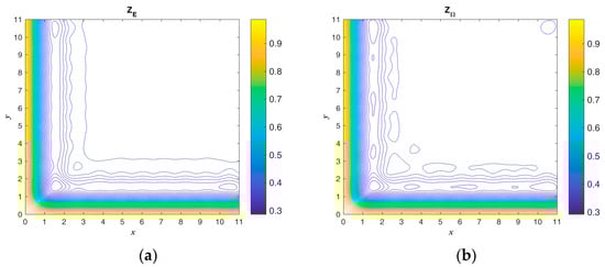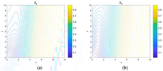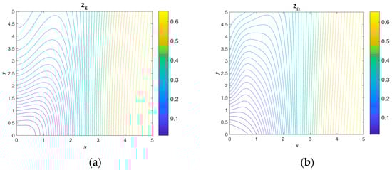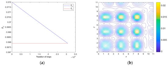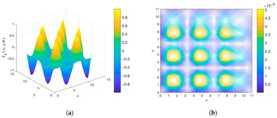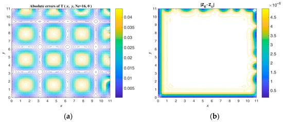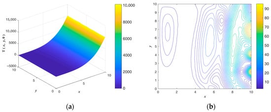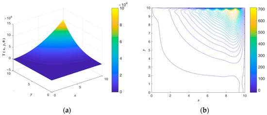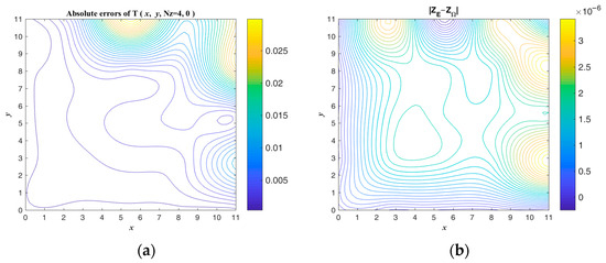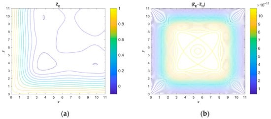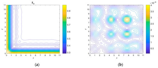 The exact ICs and numerical absolute errors are shown in Figure 9. The maximum numerical error is smaller than 4.505 when considering that the maximum temperatures of and are 1012 and 650. The exact and are compared and shown in Figure 10. Figure 8 and Figure 10b show that the initial guess value is a speedy approach to an approximate solution. When considering a sizable domain and when the same parameters and convergence criterion are used to test the noisy effect, a noise level of is applied. Figure 11 shows the calculated results and numerical absolute errors. The proposed scheme satisfies the convergence criterion within one iteration, and the maximum error is smaller than 98.429. Figure 12 shows the exact and . In Figure 11b and Figure 12b, it can be seen that the maximum error occurs from 8 to 10 in the x direction, and the contour lines close to the BCs in Figure 12b are not smooth.