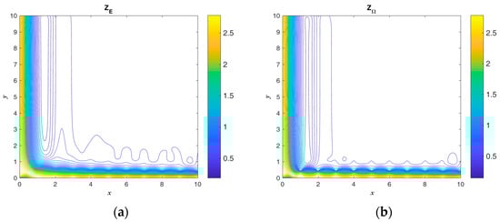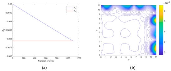 From Equation (26), the contour of is plotted in Figure 8. The figure shows a large slope change between 0 and 2.5 in the x direction. According to Equation (26), the proposed scheme converges within one iteration.