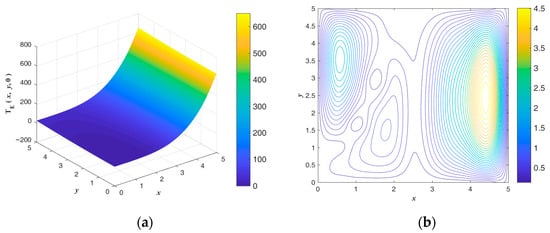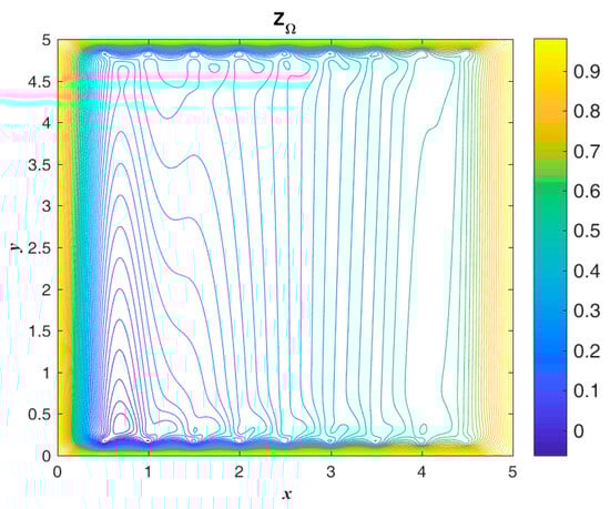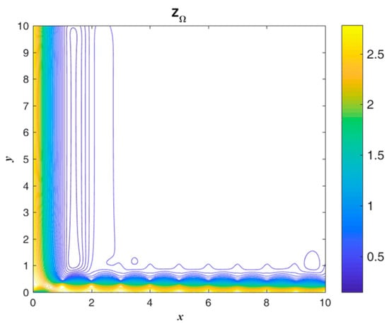 The contour of is shown in Figure 14 for the initial guess value. The exact solution and numerical absolute errors are shown in Figure 15. The maximum numerical error is smaller than 4.609 when considering that the maximum values of and are and , respectively. Figure 16 shows the exact and . As the figure shows, the domain segmentation of can be used to obtain an approximate analytical solution value.